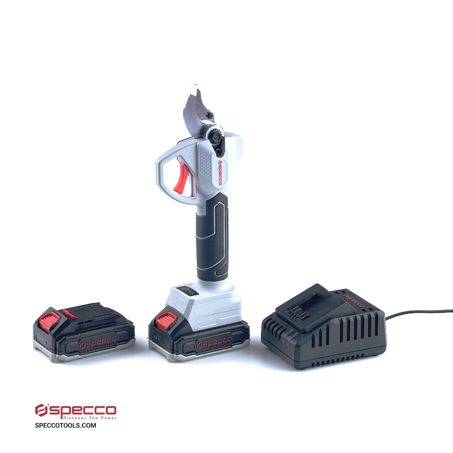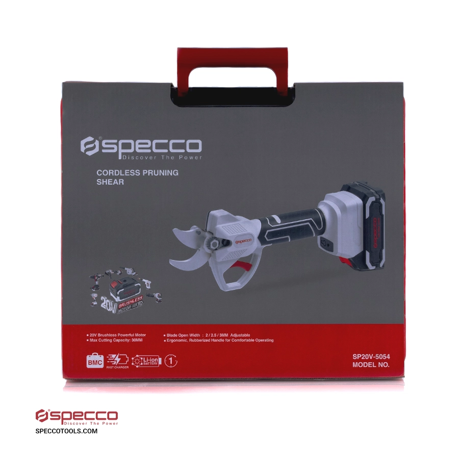 Specco Tools Cordless Pruning Shear 20V (SP20V-5054) – Lightweight 2kg design, 31×63mm motor, 30mm max cutting capacity, adjustable blade width, and cordless convenience for effortless pruning and landscaping.