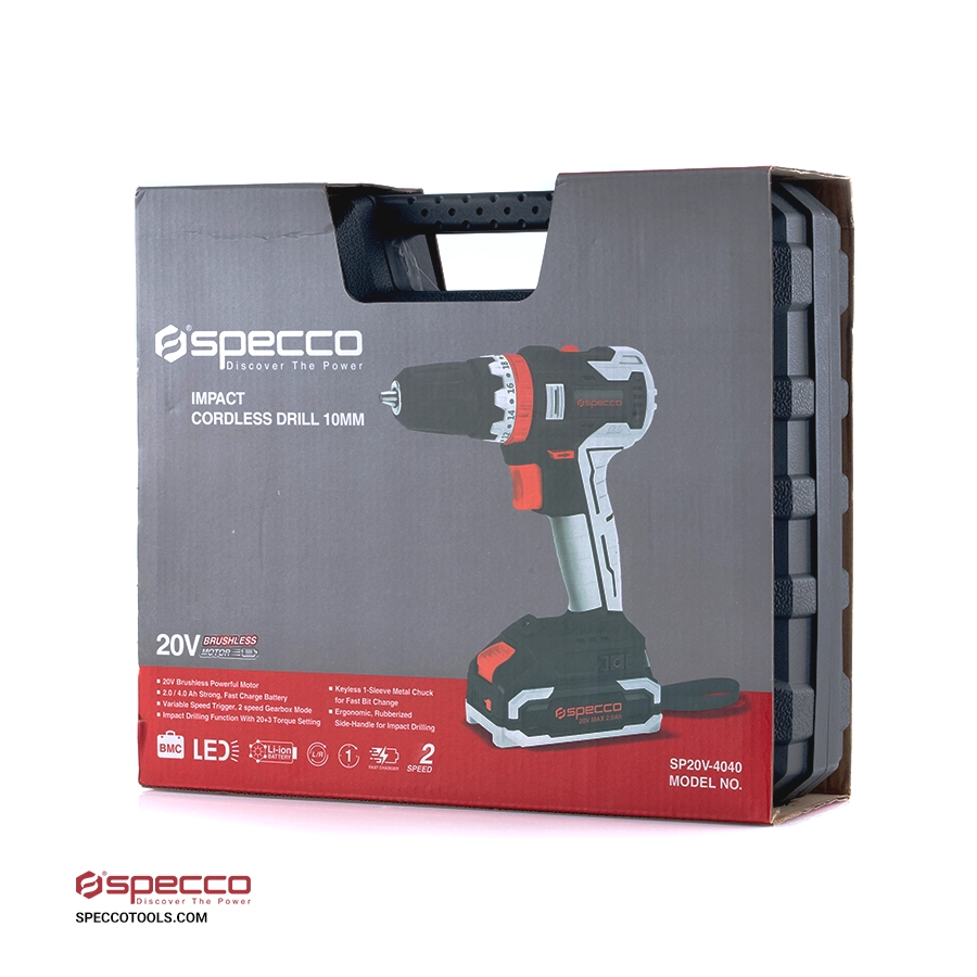 مثقاب شحن ترددي من سبيكو SP20V-4040 بقوة 20 فولت هو مثقاب شحن ترددي مريح مزود بمنصة ذات بقوة 20 فولت من سبيكو ويستخدم لحفر الثقوب زتثبيت البراغي. محرك قوي بقوة 38 نانومتر وبطارية ذات عمر طويل تصلح للاستخدام المهني ومزود ببطارية أيون ليثيوم بقوة 5/4/2 أمبير في الساعة.